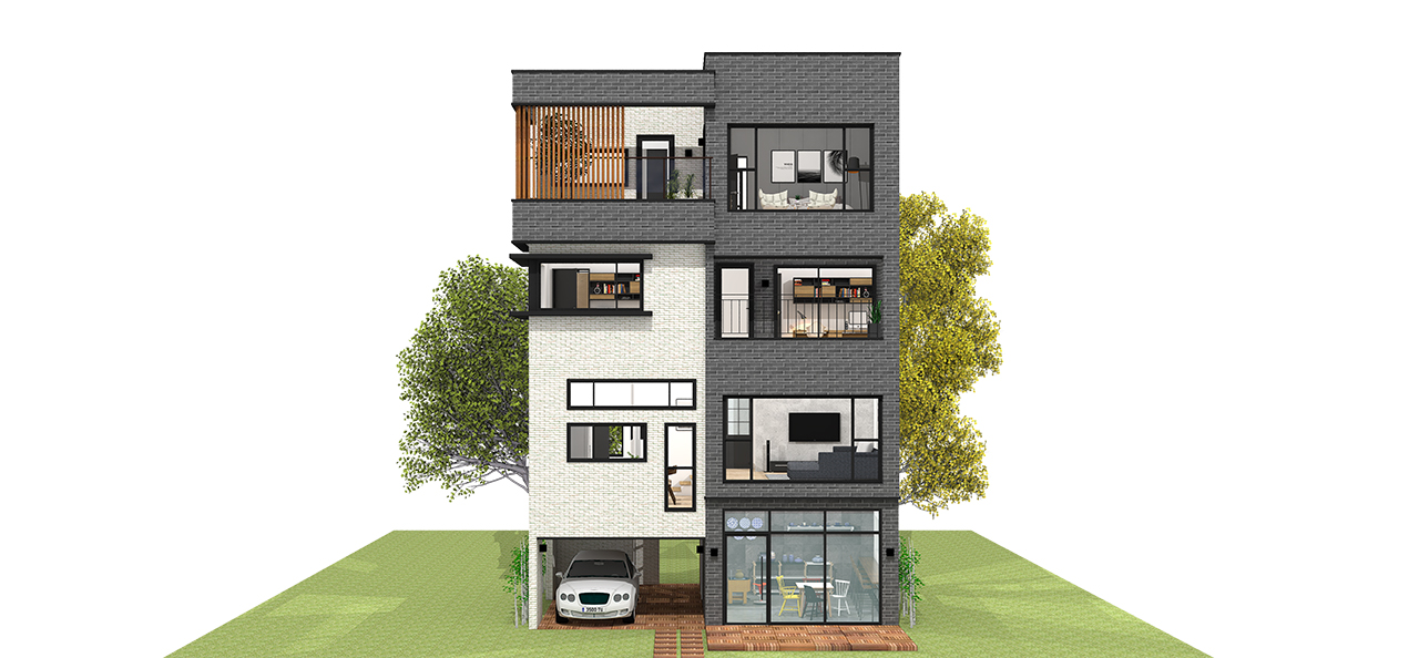 화이트&블랙 타일을 사용하고 단순한 볼륨으로 계획한 협소주택